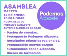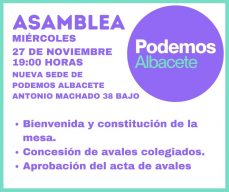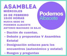 Compañeros y compañeras: La próxima asamblea del Círculo Podemos Albacete tendrá lugar el próximo MIÉRCOLES, 26 DE FEBRERO, A LAS 7 DE LA TARDE, en la NUEVA Sede de Podemos en Albacete (C Antonio Machado, 38, bajo). Dicha asamblea es abierta a toda la ciudadanía de Albacete y el orden del día incluirá los siguientes puntos: […]
