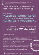 En el taller municipal aprenderemos de primera mano sobre la política más cercana. ¿Cómo funcionan tu ayuntamiento y tu diputación? ¿Podrían funcionar mejor? Si no haces política, te la hacen. ¡No faltes!